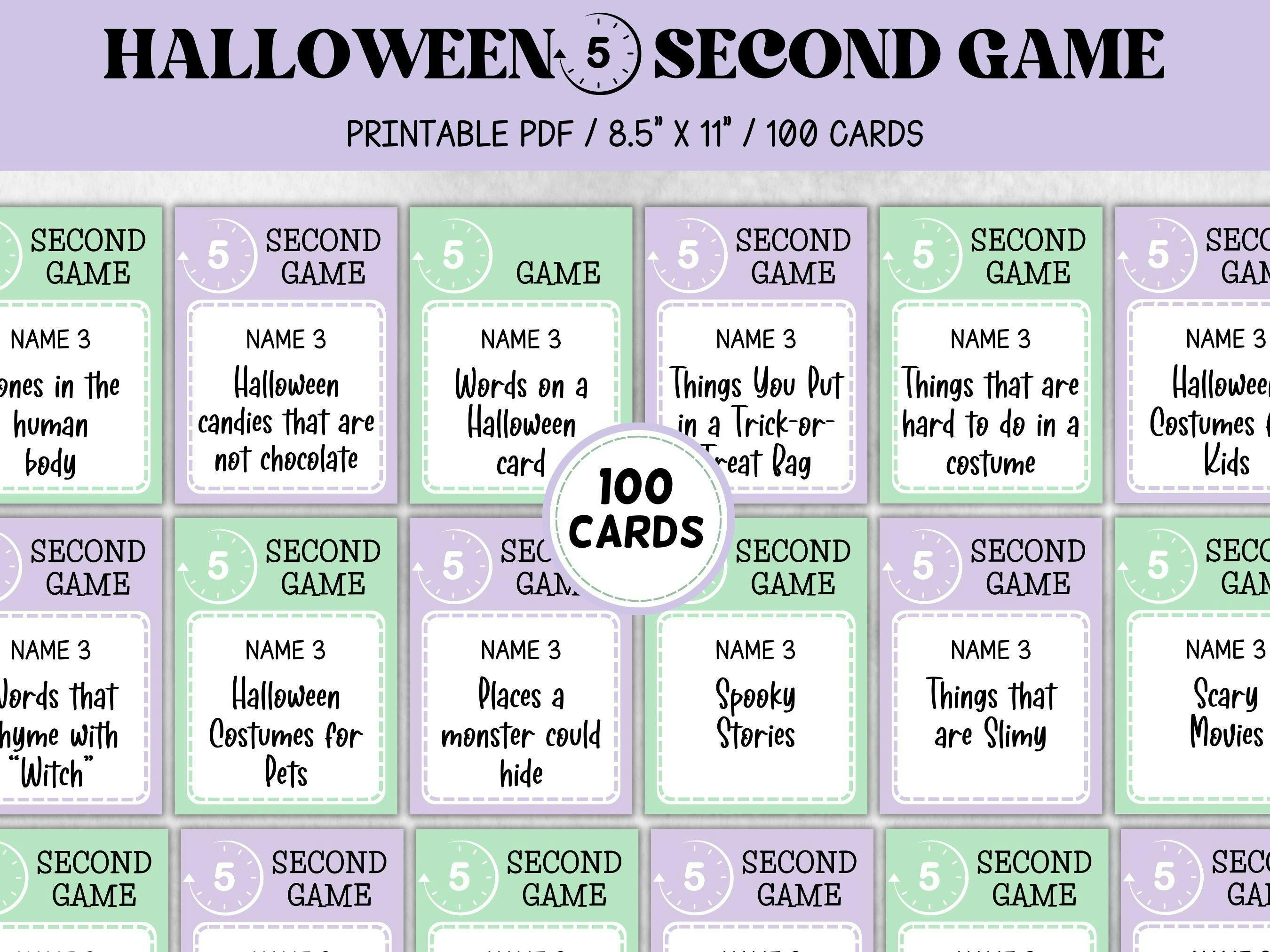 🎃 Elevate your Halloween celebrations with our versatile Halloween Pennant and thrilling Halloween 5 Second game! Perfect for adding a festive touch to your Spooky Party Night, these Halloween Activities are designed to bring excitement to any gathering. Whether you're planning a Family Game Night, School Halloween event, or Office Party, our game is suitable for all ages—from kids enjoying Halloween Trivia to teens and adults looking for a fun challenge. The vintage Halloween design adds a nostalgic touch, making it an ideal choice for a Youth Group game, Senior Living game, or Classroom Game. Imagine the laughter and joy as everyone races against the clock in this fast-paced game, creating memories that will last long after the night is over.