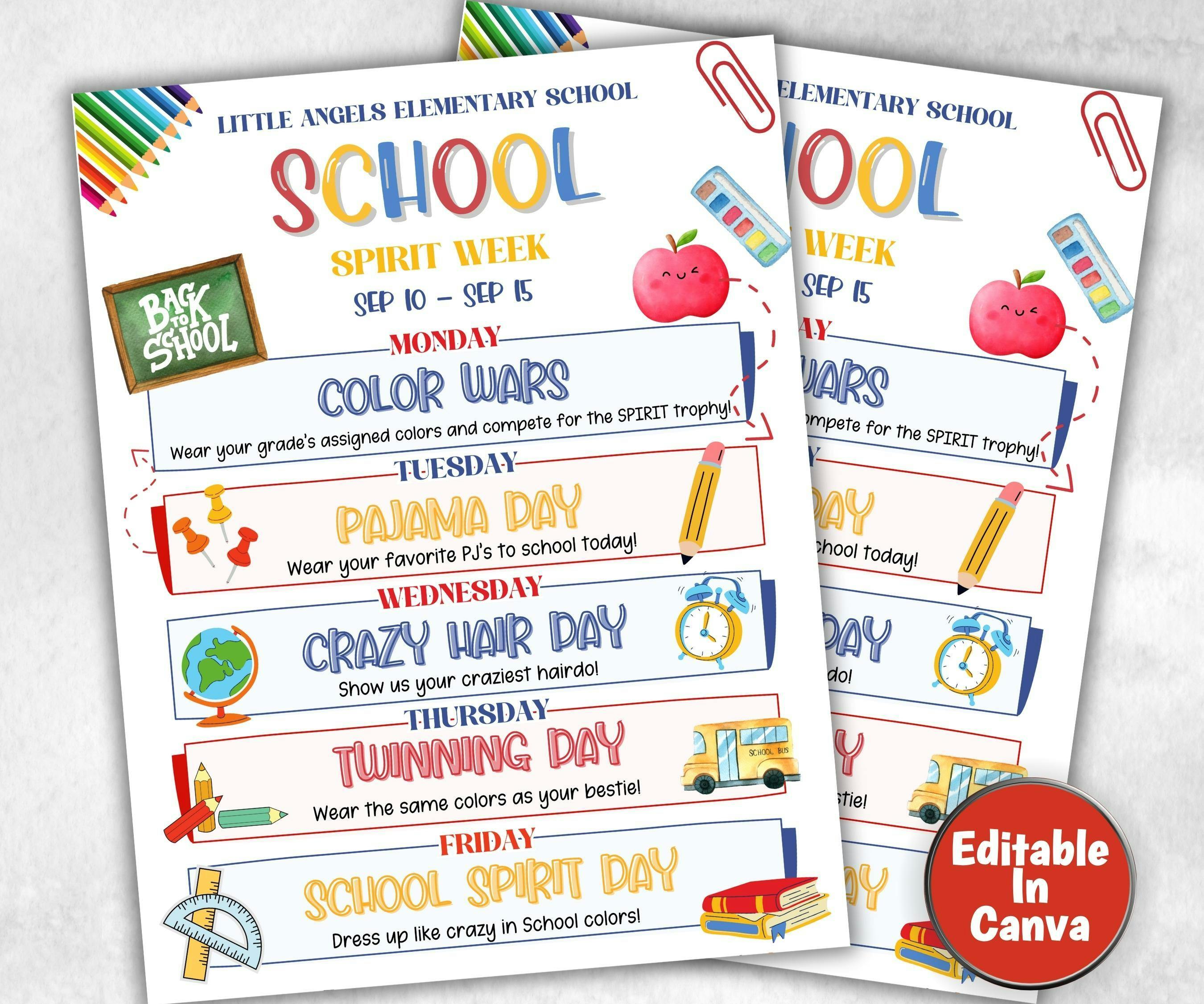 Bring excitement and school spirit to your events with our customizable School Spirit Week Flyer bundle, perfect for PTO and classroom use! This all-in-one template set is designed to keep your school community engaged and informed, covering everything from the PTO Schedule to the Back-to-School Itinerary. Whether you're organizing a School Spirit Week, planning a Welcome Back Fundraiser, or coordinating a Teacher Appreciation event, these templates make it simple to create professional, eye-catching flyers that are fully editable in Canva.